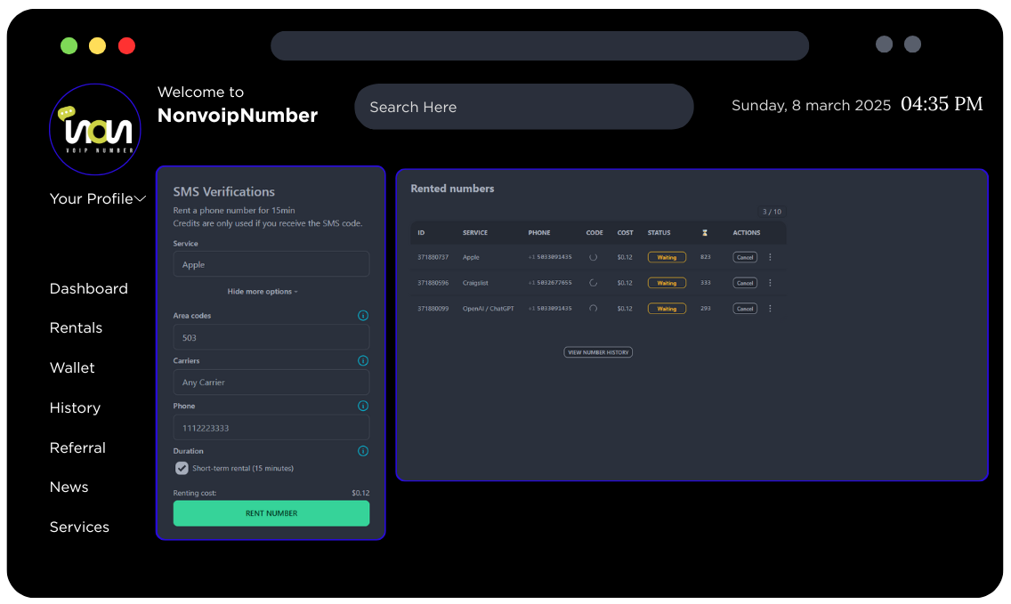 Order multiple numbers at once and receive all your verifications seamlessly. Track and manage them anytime from your dedicated Verifications Page.